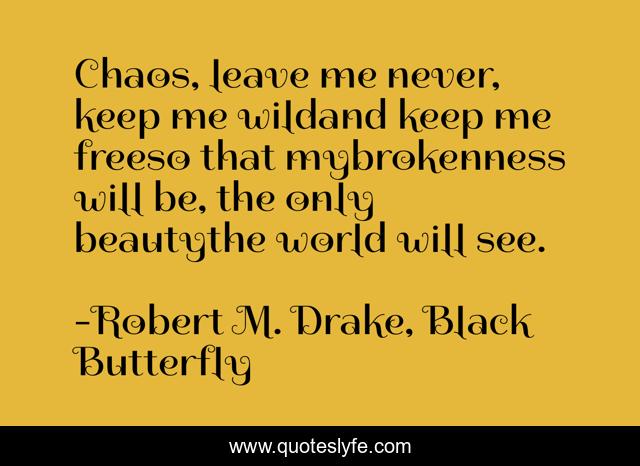 This page presents the quote "Chaos, leave me never, keep me wildand keep me freeso that mybrokenness will be, the only beautythe world will see.". Author of this quote is Robert M. Drake, Black Butterfly. This quote is about freedom, chaos, wilderness, poetry,.