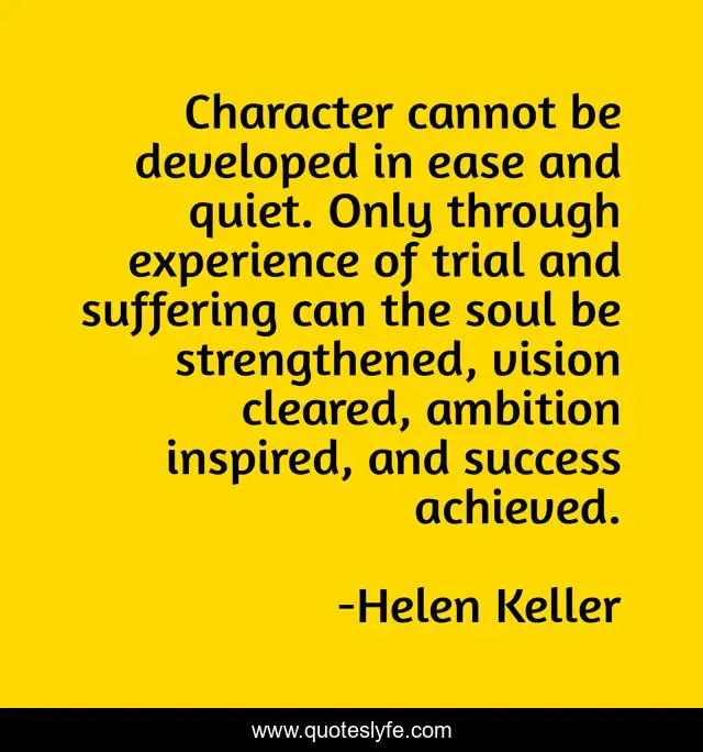 This page presents the quote "Character cannot be developed in ease and quiet. Only through experience of trial and suffering can the soul be strengthened, vision cleared, ambition inspired, and success achieved.". Author of this quote is Helen Keller. .