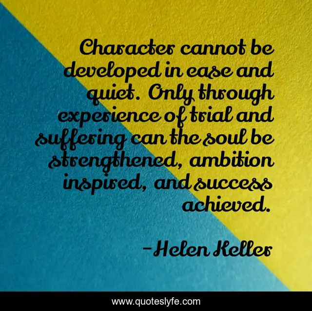 This page presents the quote "Character cannot be developed in ease and quiet. Only through experience of trial and suffering can the soul be strengthened, ambition inspired, and success achieved.". Author of this quote is Helen Keller. This quote is about success, experience,.