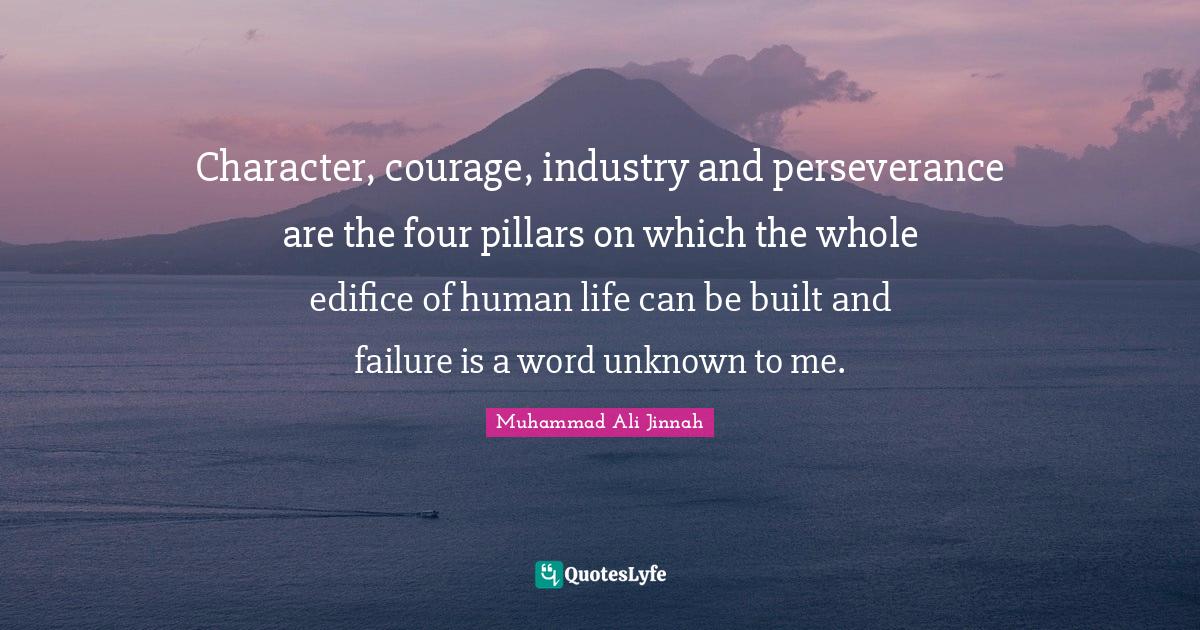This page presents the quote "Character, courage, industry and perseverance are the four pillars on which the whole edifice of human life can be built and failure is a word unknown to me.". Author of this quote is Muhammad Ali Jinnah. This quote is about courage, failure, human life, built, four, perseverance, character, pillars, whole,.