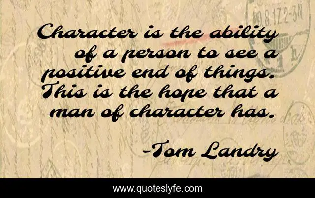 This page presents the quote "Character is the ability of a person to see a positive end of things. This is the hope that a man of character has.". Author of this quote is Tom Landry. This quote is about positive, confidence, character, man,.