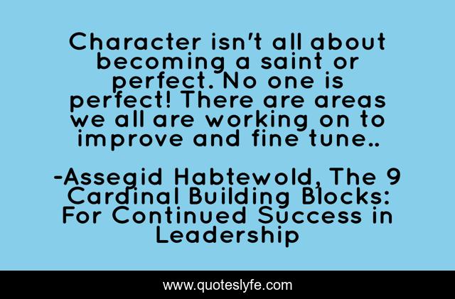 This page presents the quote "Character isn't all about becoming a saint or perfect. No one is perfect! There are areas we all are working on to improve and fine tune..". Author of this quote is Assegid Habtewold, The 9 Cardinal Building Blocks: For Continued Success in Leadership. This quote is about perfect, character, saint,.