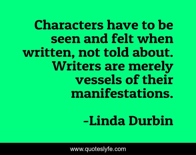 This page presents the quote "Characters have to be seen and felt when written, not told about. Writers are merely vessels of their manifestations.". Author of this quote is Linda Durbin. This quote is about characters, writers, linda-durbin, felt,.