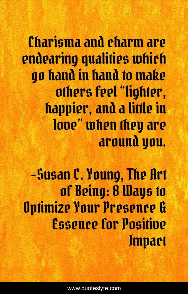 This page presents the quote "Charisma and charm are endearing qualities which go hand in hand to make others feel “lighter, happier, and a little in love” when they are around you.". Author of this quote is Susan C. Young, The Art of Being: 8 Ways to Optimize Your Presence & Essence for Positive Impact. This quote is about self-confidence, susan-young, relationship, communication-skills, communication, charisma, first-impressions, charm, motivational-speaker,.