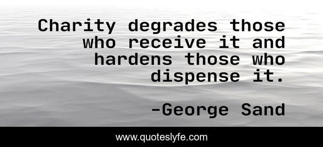 This page presents the quote "Charity degrades those who receive it and hardens those who dispense it.". Author of this quote is George Sand. This quote is about dispense, degrades, hardens, charity,.