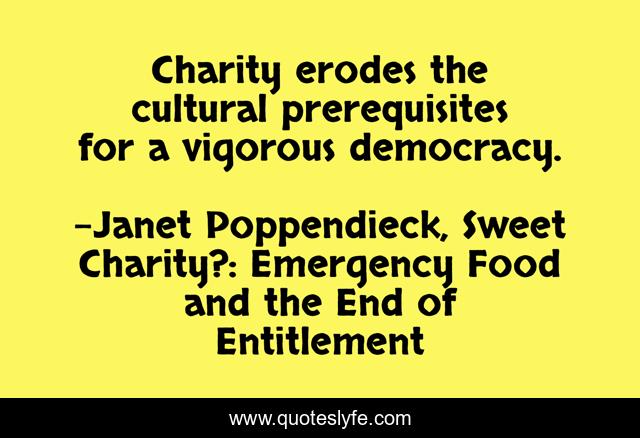 "Janet Poppendieck, Sweet Charity?: Emergency Food and the End of Entitlement Quotes." Quoteslyfe.com, 2025. Sat. 06 Dec. 2025. <https://www.quoteslyfe.com/quote/Charity-erodes-the-cultural-prerequisites-for-a-200154>.