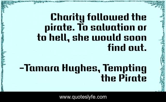 This page presents the quote "Charity followed the pirate. To salvation or to hell, she would soon find out.". Author of this quote is Tamara Hughes, Tempting the Pirate. This quote is about pirates, historical-romance, georgian, romance, adventure, historical,.