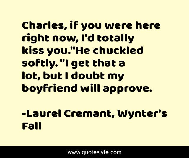 This page presents the quote "Charles, if you were here right now, I'd totally kiss you."He chuckled softly. "I get that a lot, but I doubt my boyfriend will approve.". Author of this quote is Laurel Cremant, Wynter's Fall. This quote is about romance, mythology, urban-fantasy, sensual,.