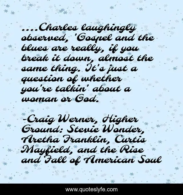"Craig Werner, Higher Ground: Stevie Wonder, Aretha Franklin, Curtis Mayfield, and the Rise and Fall of American Soul Quotes." Quoteslyfe.com, 2025. Sat. 06 Dec. 2025. <https://www.quoteslyfe.com/quote/Charles-laughingly-observed-Gospel-and-the-blues-30070>.