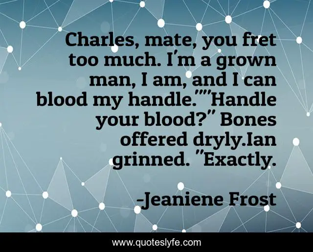 This page presents the quote "Charles, mate, you fret too much. I'm a grown man, I am, and I can blood my handle.""Handle your blood?" Bones offered dryly.Ian grinned. "Exactly.". Author of this quote is Jeaniene Frost. This quote is about bones, ian, vampires, spade,.