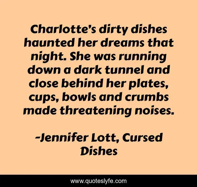 This page presents the quote "Charlotte’s dirty dishes haunted her dreams that night. She was running down a dark tunnel and close behind her plates, cups, bowls and crumbs made threatening noises.". Author of this quote is Jennifer Lott, Cursed Dishes. This quote is about fantasy, childrens-books, family-magic, cursed-dishes, children,.
