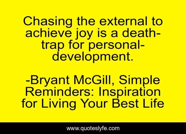 This page presents the quote "Chasing the external to achieve joy is a death-trap for personal-development.". Author of this quote is Bryant McGill, Simple Reminders: Inspiration for Living Your Best Life. This quote is about development, death, chasing, joy, external, achievement,.