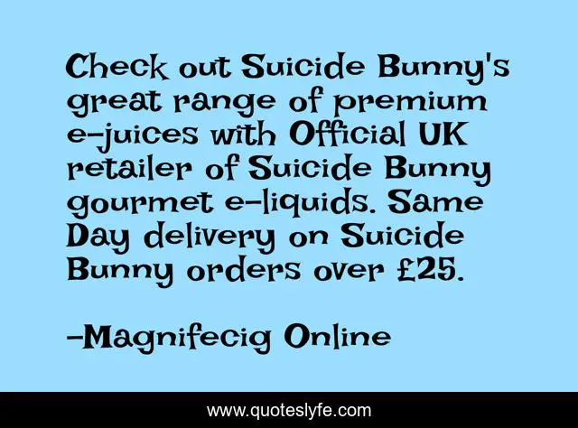 This page presents the quote "Check out Suicide Bunny's great range of premium e-juices with Official UK retailer of Suicide Bunny gourmet e-liquids. Same Day delivery on Suicide Bunny orders over £25.". Author of this quote is Magnifecig Online. This quote is about e-liquid, suicide, bunny, uk,.