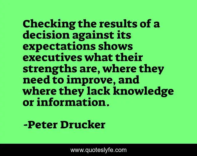 This page presents the quote "Checking the results of a decision against its expectations shows executives what their strengths are, where they need to improve, and where they lack knowledge or information.". Author of this quote is Peter Drucker. This quote is about information, decision,.