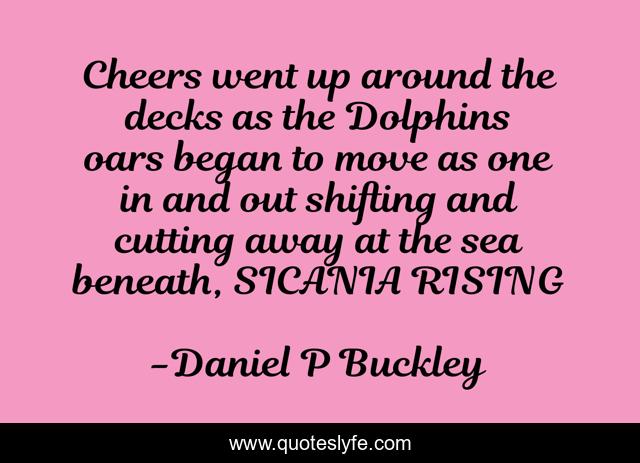 This page presents the quote "Cheers went up around the decks as the Dolphins oars began to move as one in and out shifting and cutting away at the sea beneath, SICANIA RISING". Author of this quote is Daniel P Buckley. This quote is about historical, fiction,.