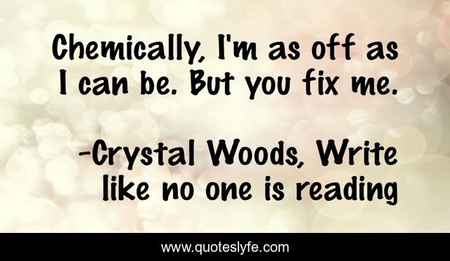 This page presents the quote "Chemically, I'm as off as I can be. But you fix me.". Author of this quote is Crystal Woods, Write like no one is reading. This quote is about relationships, chemical-imbalance, love, divorced, marriage, affection, personality,.