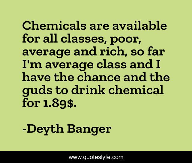 This page presents the quote "Chemicals are available for all classes, poor, average and rich, so far I'm average class and I have the chance and the guds to drink chemical for 1.89$.". Author of this quote is Deyth Banger. This quote is about available, poor, all, for, average, chemicals, classes, rich,.