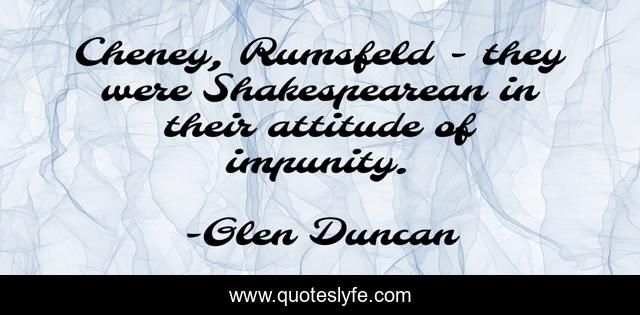 This page presents the quote "Cheney, Rumsfeld - they were Shakespearean in their attitude of impunity.". Author of this quote is Glen Duncan. .
