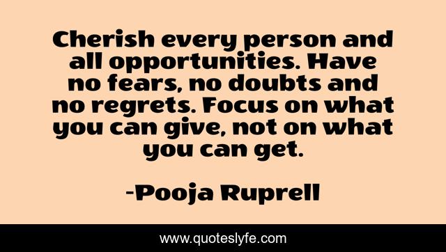 This page presents the quote "Cherish every person and all opportunities. Have no fears, no doubts and no regrets. Focus on what you can give, not on what you can get.". Author of this quote is Pooja Ruprell. This quote is about perseverance, passion, prayer,.