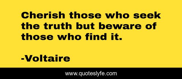 This page presents the quote "Cherish those who seek the truth but beware of those who find it.". Author of this quote is Voltaire. This quote is about denial, truths, reality, truth-hurts, truth, fear,.