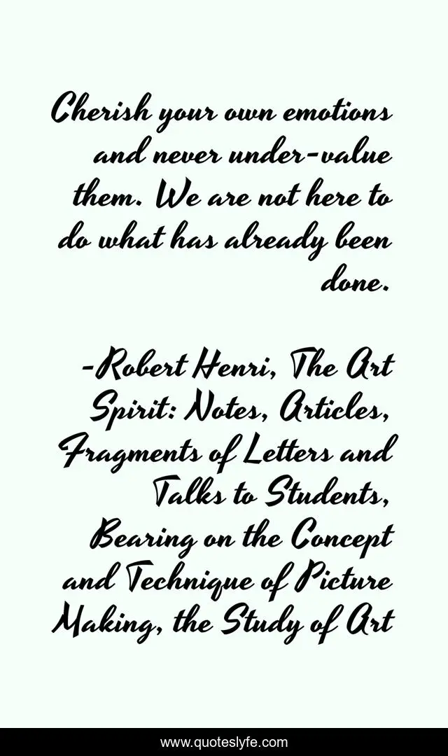 "Robert Henri, The Art Spirit: Notes, Articles, Fragments of Letters and Talks to Students, Bearing on the Concept and Technique of Picture Making, the Study of Art Quotes." Quoteslyfe.com, 2025. Fri. 05 Dec. 2025. <https://www.quoteslyfe.com/quote/Cherish-your-own-emotions-and-never-under-243846>.