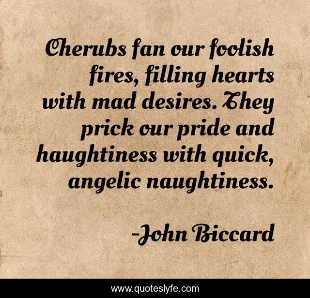 This page presents the quote "Cherubs fan our foolish fires, filling hearts with mad desires. They prick our pride and haughtiness with quick, angelic naughtiness.". Author of this quote is John Biccard. This quote is about pride, angelic, cherubs,.