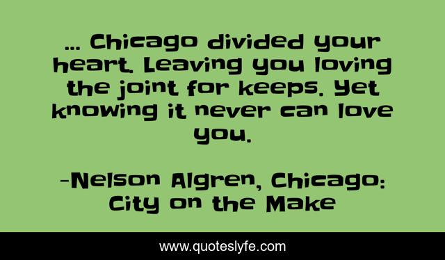 This page presents the quote "... Chicago divided your heart. Leaving you loving the joint for keeps. Yet knowing it never can love you.". Author of this quote is Nelson Algren, Chicago: City on the Make. This quote is about heart, divided, chicago, urban,.