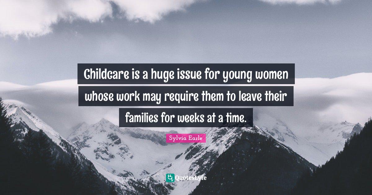 This page presents the quote "Childcare is a huge issue for young women whose work may require them to leave their families for weeks at a time.". Author of this quote is Sylvia Earle. This quote is about week, time, may, huge, young women, childcare, work,.