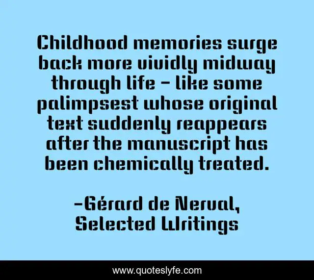 "Gérard de Nerval, Selected Writings Quotes." Quoteslyfe.com, 2025. Mon. 08 Dec. 2025. <https://www.quoteslyfe.com/quote/Childhood-memories-surge-back-more-vividly-midway-164364>.