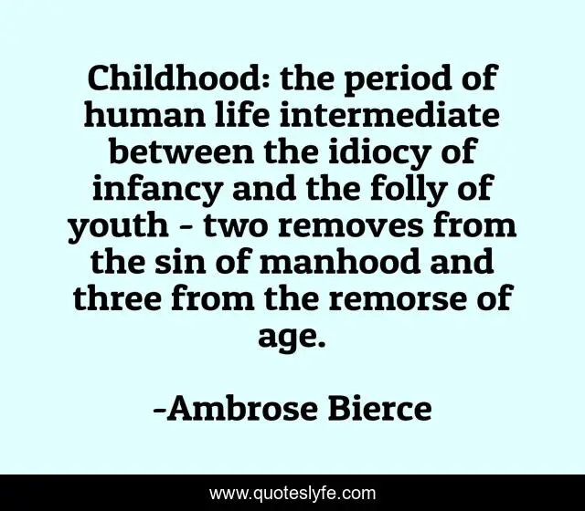 This page presents the quote "Childhood: the period of human life intermediate between the idiocy of infancy and the folly of youth - two removes from the sin of manhood and three from the remorse of age.". Author of this quote is Ambrose Bierce. This quote is about youth, life, childhood,.
