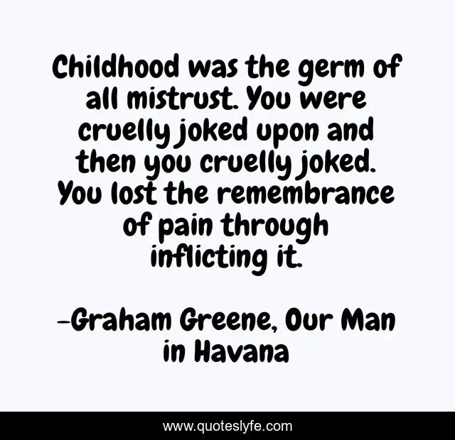 This page presents the quote "Childhood was the germ of all mistrust. You were cruelly joked upon and then you cruelly joked. You lost the remembrance of pain through inflicting it.". Author of this quote is Graham Greene, Our Man in Havana. This quote is about jokes, pain, childhood,.