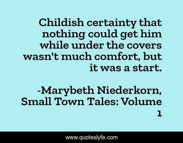 This page presents the quote "Childish certainty that nothing could get him while under the covers wasn't much comfort, but it was a start.". Author of this quote is Marybeth Niederkorn, Small Town Tales: Volume 1. This quote is about fear, comfort, horror, bed,.