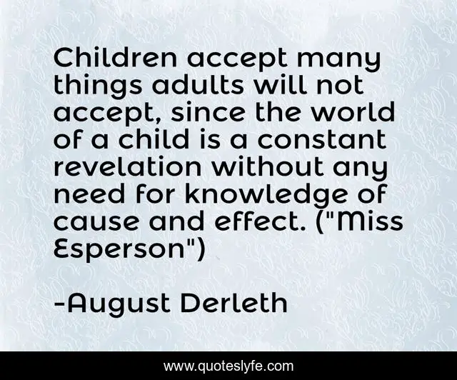 This page presents the quote "Children accept many things adults will not accept, since the world of a child is a constant revelation without any need for knowledge of cause and effect. ("Miss Esperson")". Author of this quote is August Derleth. This quote is about imagination, children,.