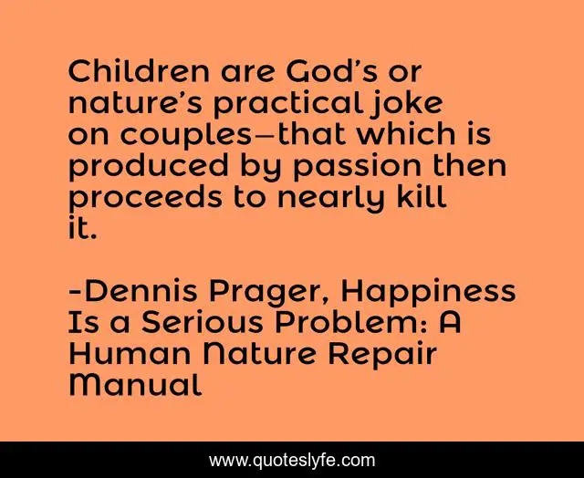This page presents the quote "Children are God’s or nature’s practical joke on couples—that which is produced by passion then proceeds to nearly kill it.". Author of this quote is Dennis Prager, Happiness Is a Serious Problem: A Human Nature Repair Manual. This quote is about marital-issues, marriage, children, happiness, kids,.