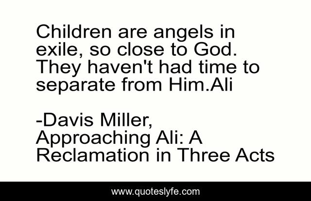 This page presents the quote "Children are angels in exile, so close to God. They haven't had time to separate from Him.Ali". Author of this quote is Davis Miller, Approaching Ali: A Reclamation in Three Acts. This quote is about parenthood, discipleship, mentoring,.