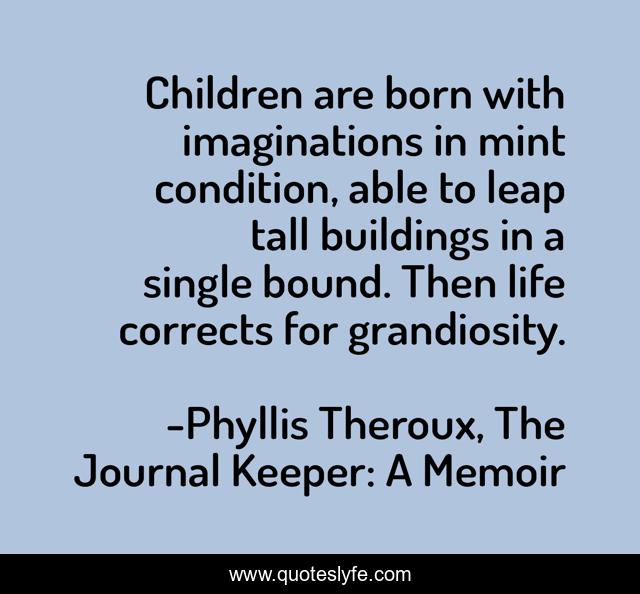This page presents the quote "Children are born with imaginations in mint condition, able to leap tall buildings in a single bound. Then life corrects for grandiosity.". Author of this quote is Phyllis Theroux, The Journal Keeper: A Memoir. This quote is about grandiosity, imagination, children,.