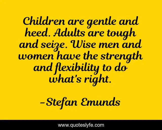 This page presents the quote "Children are gentle and heed. Adults are tough and seize. Wise men and women have the strength and flexibility to do what's right.". Author of this quote is Stefan Emunds. This quote is about wisdom, courage, mankind, inspirational, enthusiasm, honor, humanity,.