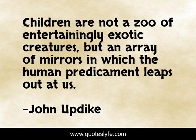 This page presents the quote "Children are not a zoo of entertainingly exotic creatures, but an array of mirrors in which the human predicament leaps out at us.". Author of this quote is John Updike. This quote is about childhood, human, children,.