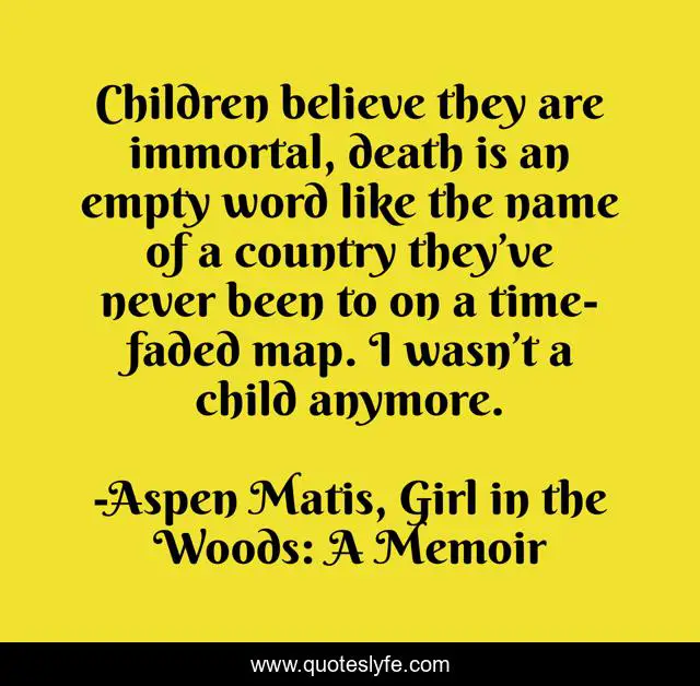 This page presents the quote "Children believe they are immortal, death is an empty word like the name of a country they’ve never been to on a time-faded map. I wasn’t a child anymore.". Author of this quote is Aspen Matis, Girl in the Woods: A Memoir. This quote is about aspen-matis, memoir, hiking, wisdom,.