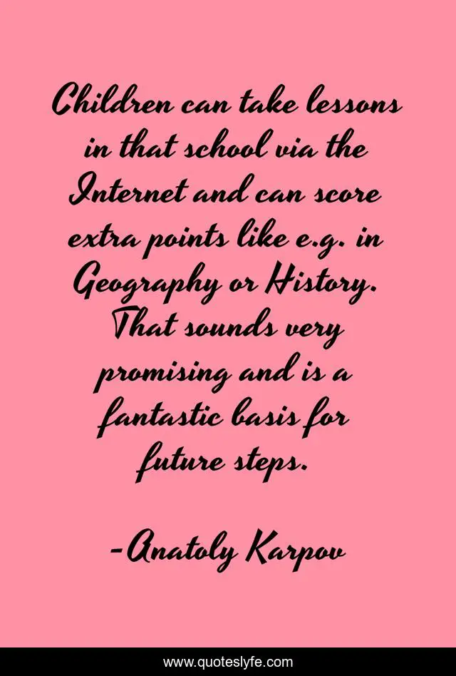 This page presents the quote "Children can take lessons in that school via the Internet and can score extra points like e.g. in Geography or History. That sounds very promising and is a fantastic basis for future steps.". Author of this quote is Anatoly Karpov. This quote is about school, future, children,.