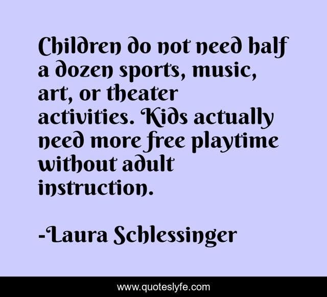 This page presents the quote "Children do not need half a dozen sports, music, art, or theater activities. Kids actually need more free playtime without adult instruction.". Author of this quote is Laura Schlessinger. This quote is about activites, children, stay-at-home-moms,.