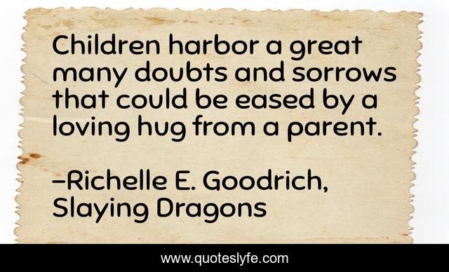 This page presents the quote "Children harbor a great many doubts and sorrows that could be eased by a loving hug from a parent.". Author of this quote is Richelle E. Goodrich, Slaying Dragons. This quote is about richelle-e-goodrich, richelle-goodrich, parenting, parents, hugs, richelle, children,.