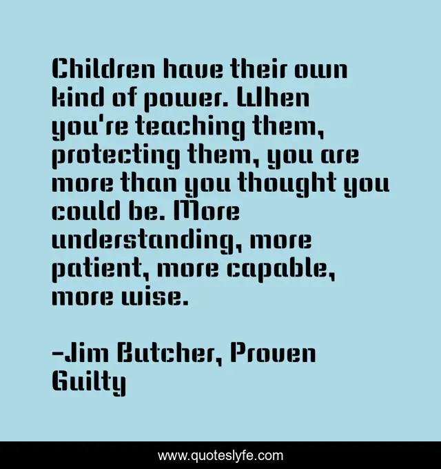 This page presents the quote "Children have their own kind of power. When you're teaching them, protecting them, you are more than you thought you could be. More understanding, more patient, more capable, more wise.". Author of this quote is Jim Butcher, Proven Guilty. .