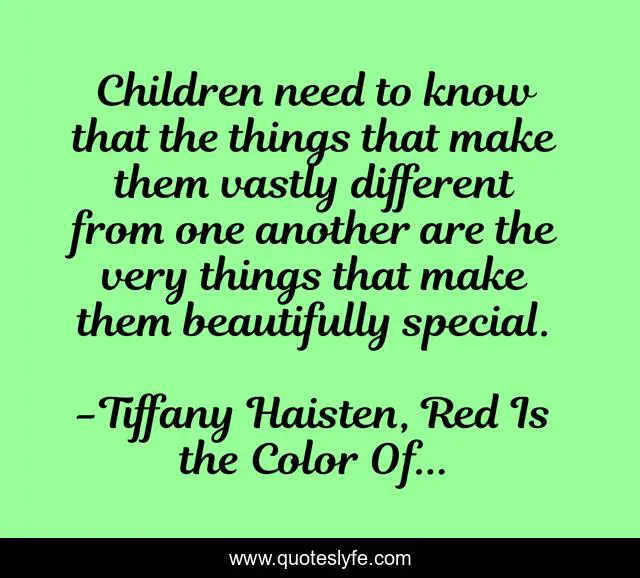 This page presents the quote "Children need to know that the things that make them vastly different from one another are the very things that make them beautifully special.". Author of this quote is Tiffany Haisten, Red Is the Color Of.... This quote is about beautiful, children, special, self-esteem,.