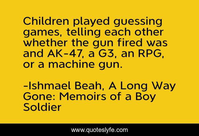 This page presents the quote "Children played guessing games, telling each other whether the gun fired was and AK-47, a G3, an RPG, or a machine gun.". Author of this quote is Ishmael Beah, A Long Way Gone: Memoirs of a Boy Soldier. This quote is about memoirs, sierra-leone, coming-of-age, childhood,.