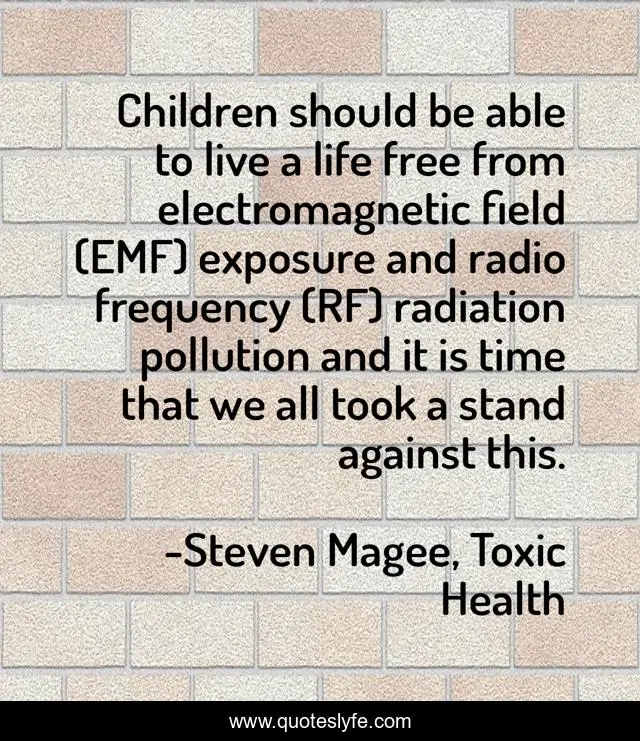 This page presents the quote "Children should be able to live a life free from electromagnetic field (EMF) exposure and radio frequency (RF) radiation pollution and it is time that we all took a stand against this.". Author of this quote is Steven Magee, Toxic Health. This quote is about we, emf, live, exposure, electromagnetic, able, radiation, life, against,.