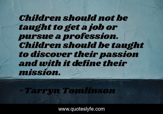 This page presents the quote "Children should not be taught to get a job or pursue a profession. Children should be taught to discover their passion and with it define their mission.". Author of this quote is Tarryn Tomlinson. This quote is about parenting, parenting-teenagers, parenting-tips, parenting-advice,.
