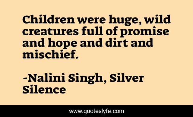 This page presents the quote "Children were huge, wild creatures full of promise and hope and dirt and mischief.". Author of this quote is Nalini Singh, Silver Silence. This quote is about mischief, promise, children, dirt,.