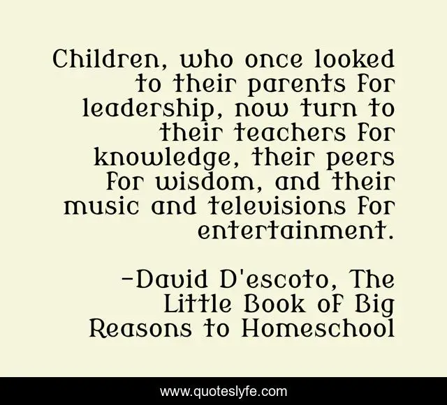 This page presents the quote "Children, who once looked to their parents for leadership, now turn to their teachers for knowledge, their peers for wisdom, and their music and televisions for entertainment.". Author of this quote is David D'escoto, The Little Book of Big Reasons to Homeschool. This quote is about homeschooling, education,.