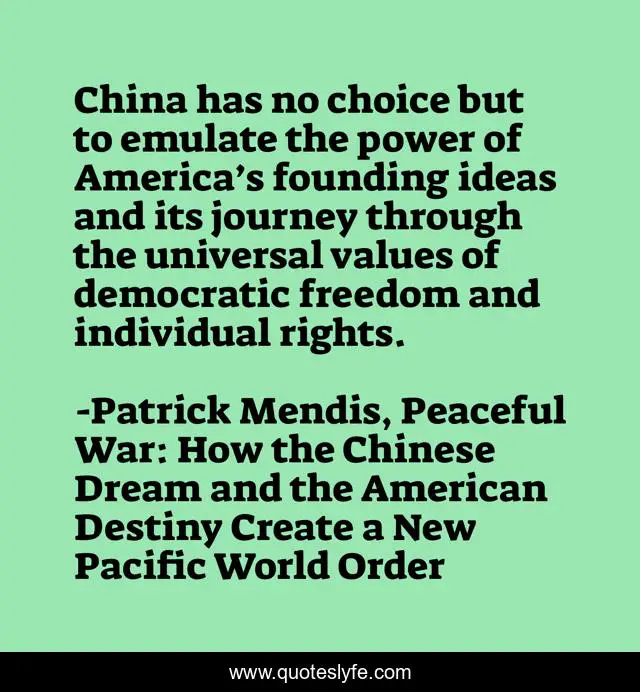 This page presents the quote "China has no choice but to emulate the power of America’s founding ideas and its journey through the universal values of democratic freedom and individual rights.". Author of this quote is Patrick Mendis, Peaceful War: How the Chinese Dream and the American Destiny Create a New Pacific World Order. This quote is about individual-rights, democracy, freedom, china, founding-ideas, universal-values, america,.